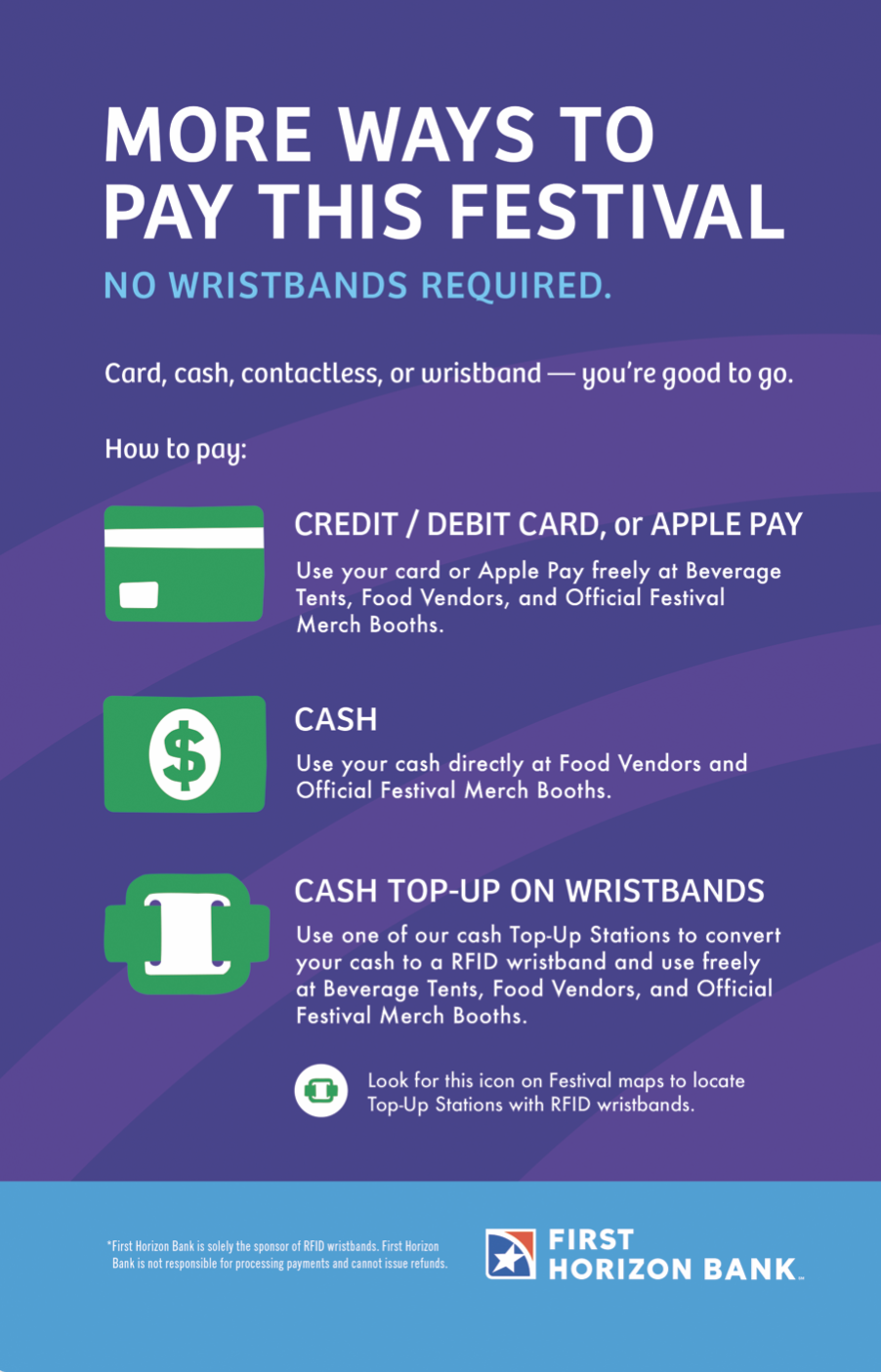 WRISTBANDS ARE BROUGHT TO US BY FIRST HORIZON BANK! You can visit any RFID cash tent on Festival grounds to add cash to your bands.